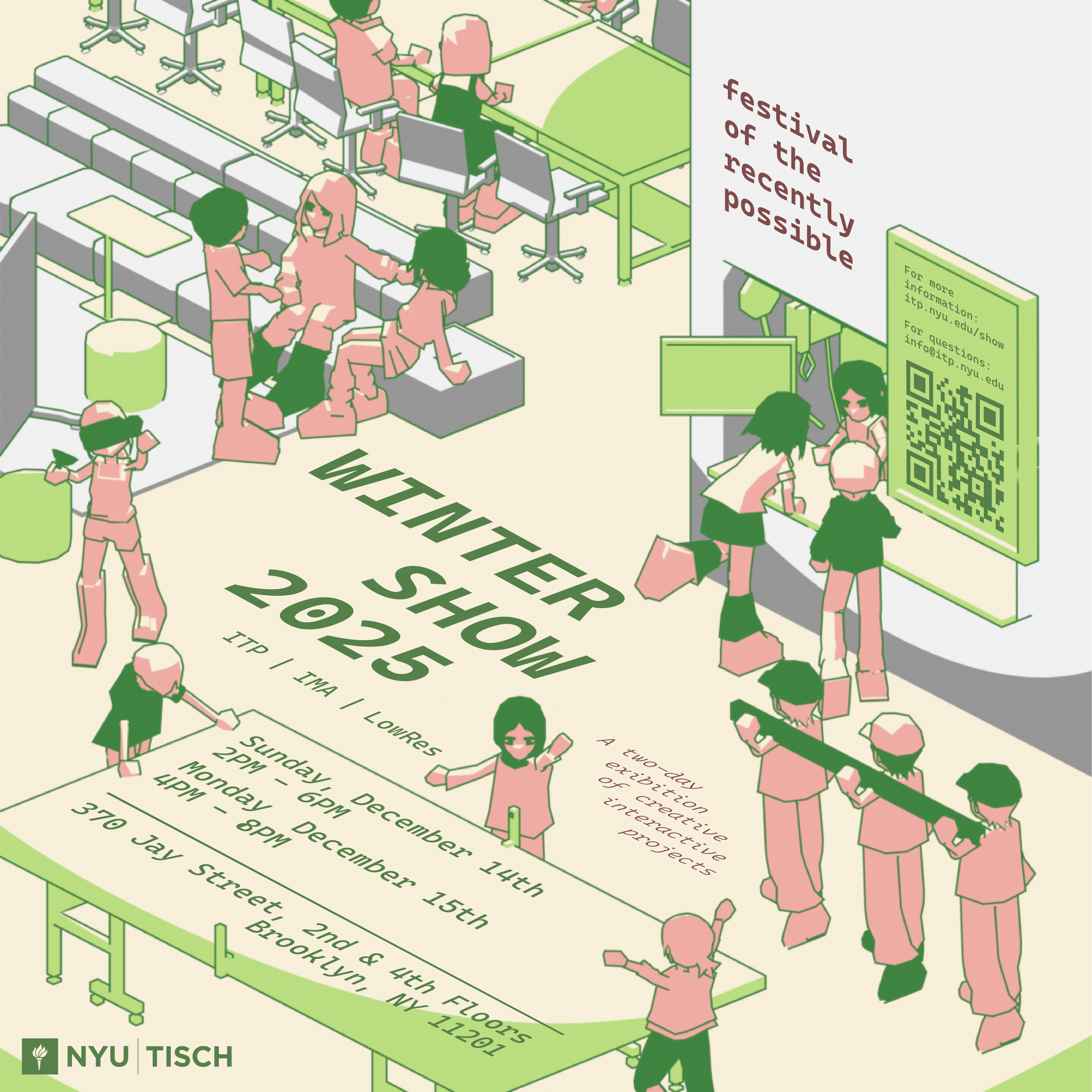 Poster design for New York University's Interactive Telecommunications Program (ITP) and Interactive Media Arts (IMA) winter showcase! This poster was defined by the prompt: "For this challenge, we are inspired by topics like physicality, connectedness, shared space, and celebration. We’re looking for a strong conceptual design that communicates the ITP/IMA ethos. We would like to see the more humanistic side of our community and fewer wires, breadboards, and LEDs."