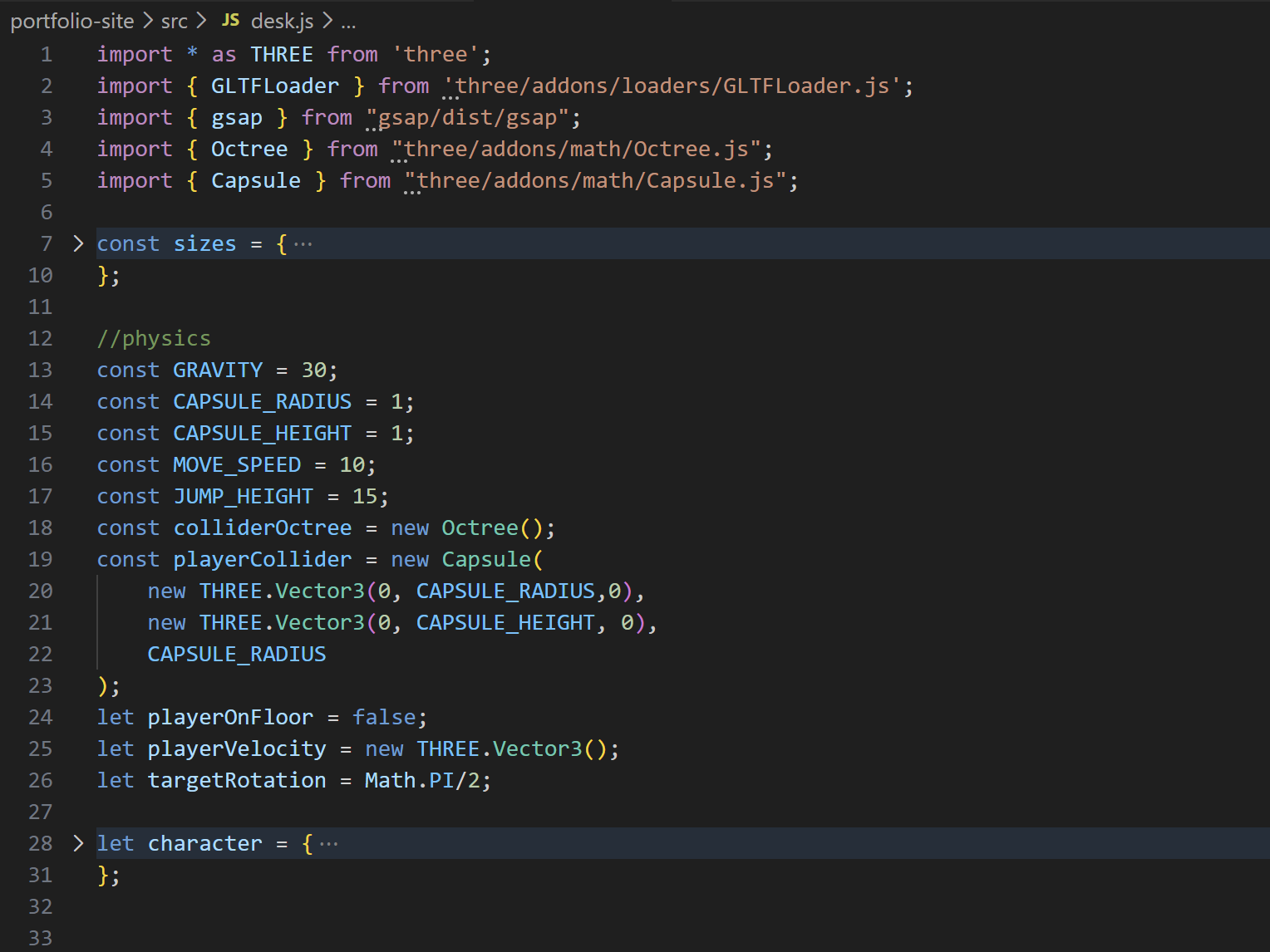 Once the model was completed, I loaded it into the webpage with Three.js. Then came the animations, mouse movement, and hitboxes. These were all made with Javascript. I used the GSAP Javascript library for the mouse movements for a natural easing motion.The biggest challenge in this process was doing the hitboxes. It required me to create a new model with objects for the hitbox and edit the normal map. Then the mouse needed it's own hitbox too. The hitbox logic I used for the "player" was capsules, which means that there is a imagined capsule generated around the mouse and acts as the barrier. For this system I imported the Three.js addons Capsule.js and Octree.js.