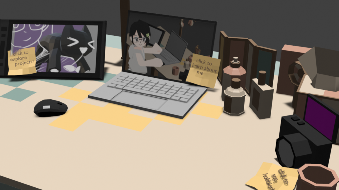 When modeling my desk, I thought about the user navigation carefully. On one hand, I intended for this to be a more playful version of a traditional portfolio site. A site where you could explore and appreciate the site as itself, not only as a vessel for the information it holds. The main navigation of the website is by using the WASD or arrow buttons to control a mouse on my desk, the front area is pretty open and the different pages are easy to navigate to. I took inspiration from 3D video games, the keyboard movement, the slight visual hints to indicate interaction, and the hovering to highlight. A website communicating information should be clear, so I didn't take many risks with the user interface.